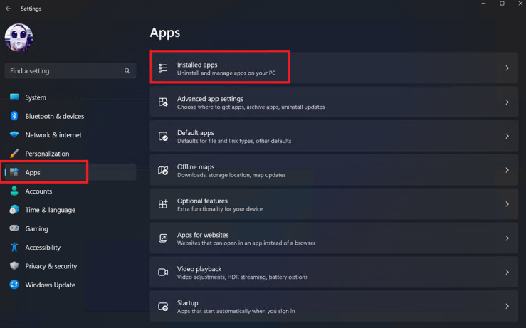 2. 单击“已安装的应用程序”以查看所有已安装应用程序的列表。