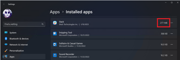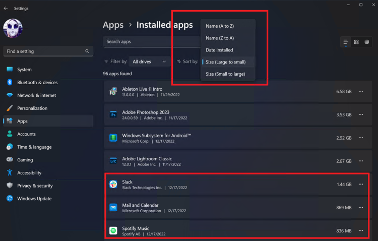 在那里,我建议按大小排序,最大的排在第一位。请注意,您还可以按安装日期或名称排序。节省磁盘空间的一个好方法是简单地卸载此列表中您不使用的所有内容。但这与我们的主要任务无关。忘掉 Ableton Live 和 Adobe Photoshop 等大型媒体应用程序吧——它们会占用大量空间,而且没有办法解决。但请注意下面列表中的几个 Microsoft Store 应用程序占用的磁盘空间超出了合理范围,因为它们都是关于将数据存储在云中的:Mail、Slack 和 Spotify。