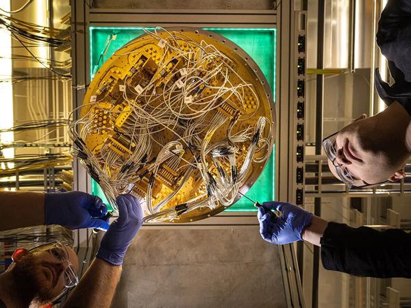 Google Quantum AI 研究人员检查超导电路阵列,这些超导电路阵列构成了他们用来开发一种称为拓扑量子计算的新方法的系统