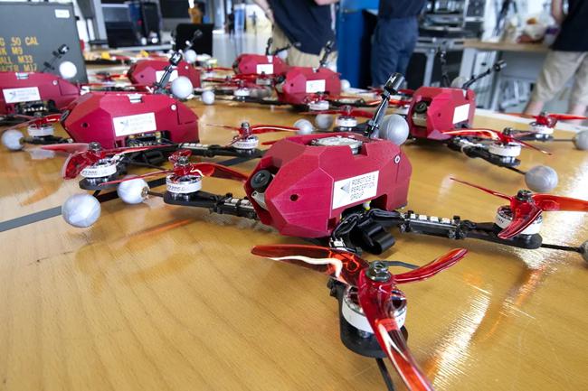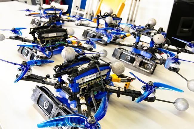 虽然每架载人无人机(红色)都配备了 FPV 摄像头,但每架自主无人机(蓝色)都配备了由 Nvidia Jetson TX2 机载计算机提供支持的英特尔实感视觉系统。两组无人机还配备了由外部摄像头系统跟踪的反射标记。