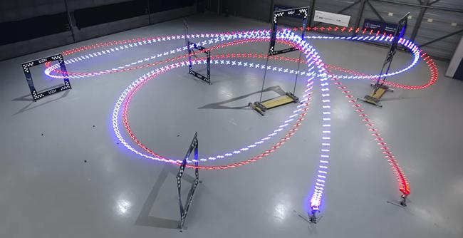 比赛场地由专业无人机飞行员设计,共有七个门,体积为30 x 30 x 8米。大门的布置要求无人机执行复杂的杂技动作,其中自动无人机系统 Swift(蓝色)的路线比人类驾驶的无人机(红色)要紧得多,如延时拍摄所示图像。