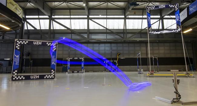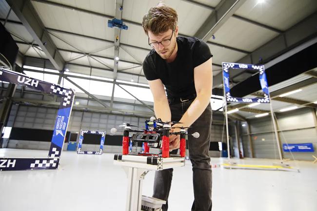 苏黎世大学的埃利亚·考夫曼 (Elia Kaufmann) 正在为比赛准备一架基于自主视觉的无人机。由于起落架只会减慢竞赛无人机的速度,因此它们会从支架上起飞,这样它们就可以直接向第一道门发射