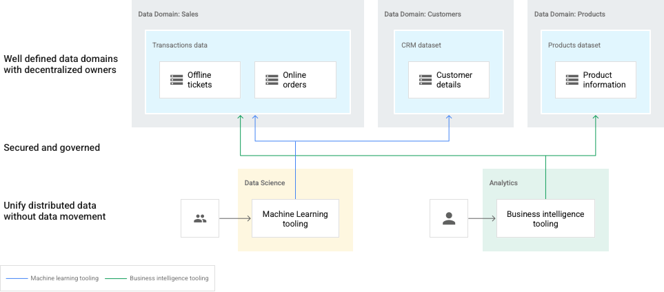 跨存储在多个 Google Cloud 项目中的数据构建特定于域的数据网格,无需任何数据移动。