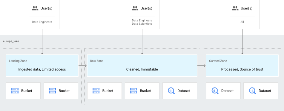 另一个常见的用例是,您的数据仅供数据工程师访问,随后经过改进并提供给数据科学家和分析师使用。在这种情况下,您可以设置一个湖,为工程师可以访问的数据提供一个原始区域,为数据科学家和分析师提供的数据提供一个精选区域。