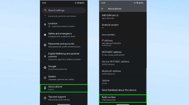 显示 Android 14 中“关于手机”和“版本号”的位置的屏幕截图