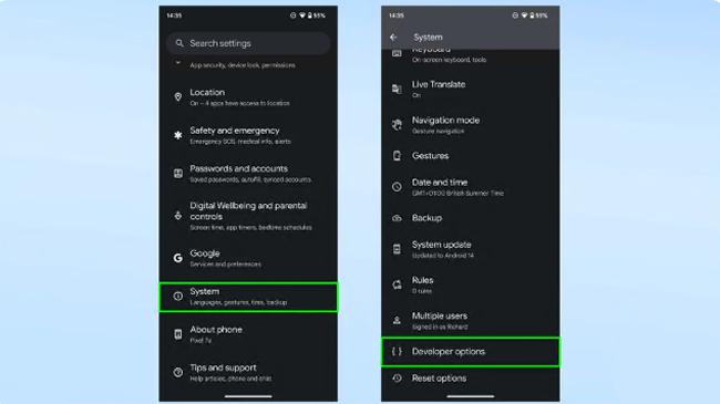 显示 Android 14 中开发者选项位置的屏幕截图