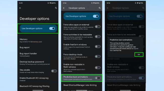 首先,打开屏幕顶部的“使用开发人员选项” 。然后向下滚动很长一段距离到“切换预测后退动画”,并将其也打开。您必须在随后弹出的框中点击“确定” ,然后才能尝试该功能。