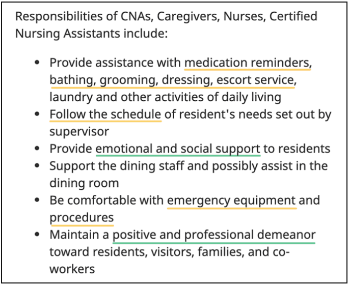 识别这些重要工作技能的最佳方法是分析您所在行业的职位空缺。以这份招聘护士职位的招聘广告为例。为方便起见,我们突出显示了绿色的软技能和黄色的硬技能: