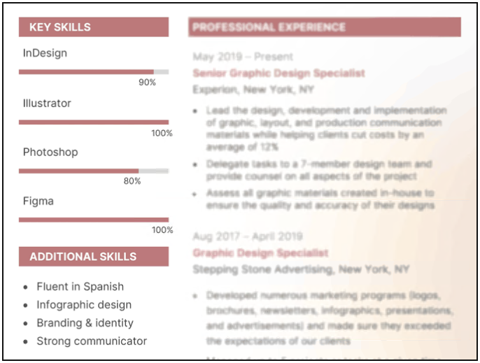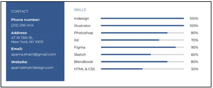 此外,如果你想让你的简历看起来更有创意,你可以使用技能栏(或技能水平)列出你的熟练程度。