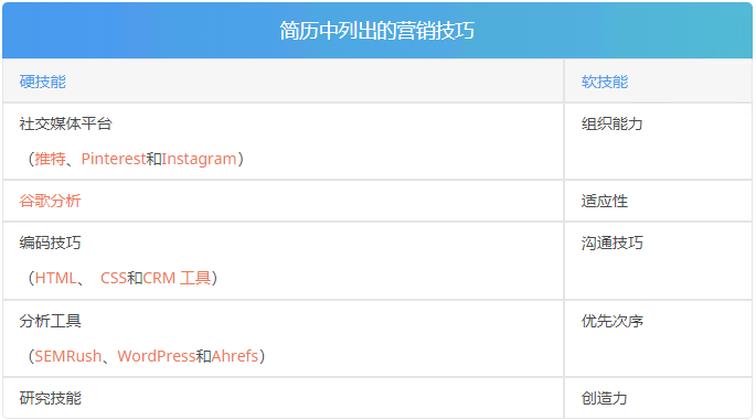 下面列出的营销技巧非常适合营销简历,因为它们表明您可以轻松使用行业特定的工具: