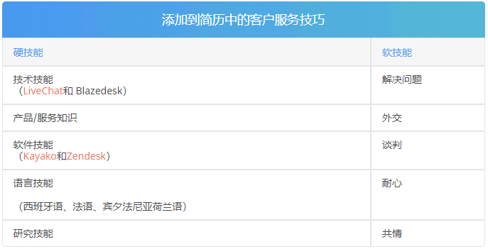 如果你在呼叫中心工作或处理客户问题,你可以将这些客户服务技能添加到你的简历中。CSR 技能向招聘经理展示您擅长与客户打交道,并且知道如何使用软件来跟踪客户问题: