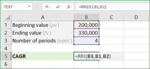 目前在 Excel 中计算 CAGR 的另一种方法是RRI公式。它还有 3 个核心参数:周期数、起始值和结束值。再一次,我们在下面设置了一个示例来向您展示如何使用此功能。