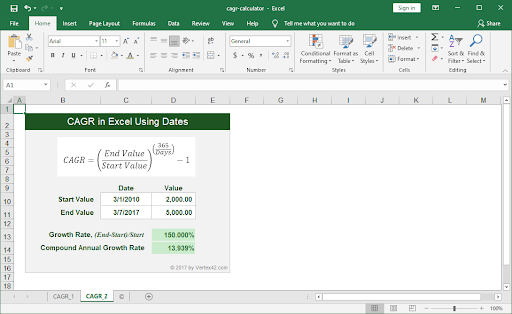 多亏了这个自动计算器,你再也不用担心计算你的复合年增长率了。使用 Vertex42 的在线 CAGR 计算器和相应的Excel 模板,您可以轻松获得这个数字,而无需手动输入公式。