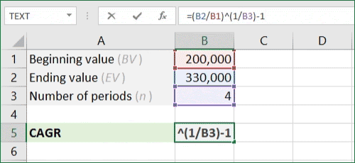 您的公式应如下所示:=(EV/BV)^(1/n)-1 。在我们的示例中,公式为=(B2/B1)^(1/B3)-1 。