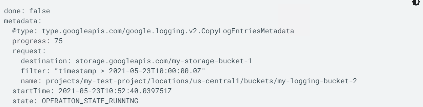此命令会创建一个长时间运行的操作,用于在后台运行以及返回复制操作的名称以及日志存储桶的位置: