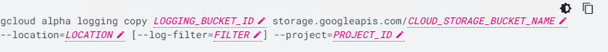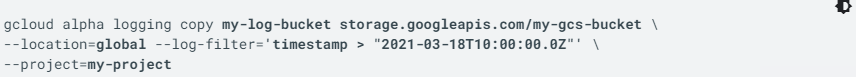 注意:如果有效 gcloud CLI 配置设置为所需的 Cloud 项目,则可以省略 --project 标志。如果您不使用 --log-filter=FILTER 标志,则 Logging 存储桶中的所有日志条目都会复制到 Cloud Storage 存储桶。