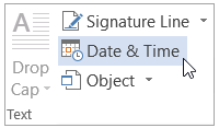 在插入选项卡的文本组中,单击日期和时间
