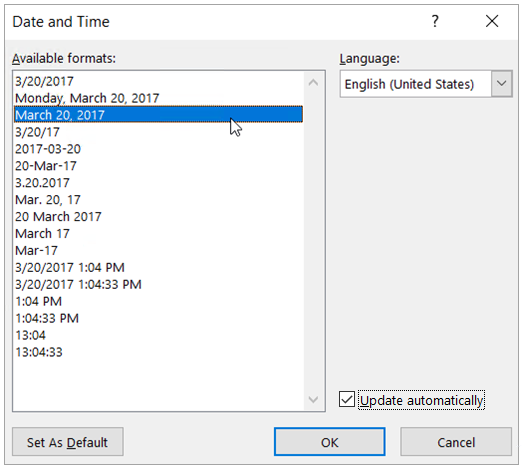从“日期和时间”对话框中,选择您喜欢的格式。