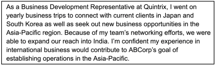 这一段之所以有效,是因为候选人表明他们已经成功建立了新的国际业务关系。然后,他们将该经验与他们申请合作的公司的当前业务目标联系起来。