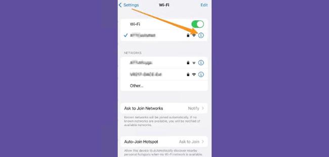 箭头指向蓝色信息按钮,该按钮是 iPhone 的 WiFi 设置中的一个圆圈,里面有一个 I。