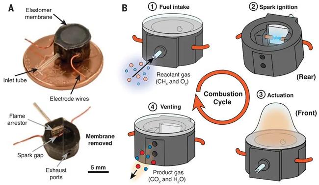 为该机器人提供动力的两个执行器的重量仅为 325 毫克,大约是一美分硬币大小的四分之一。它们之所以如此之小,部分原因是大多数相关部件都在机外,包括燃料本身、混合和输送燃料的系统以及火花发生器的电源。但即使没有所有这些东西,执行器也有很多功能可以使其能够在高循环频率下连续运行而不会熔化。