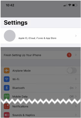 点击“设置”应用程序顶部显示的您的Apple ID 名称。您可以在这里管理您的 Apple ID、iCloud、iTunes、AppStore 以及与您的个人帐户直接相关的其他功能。