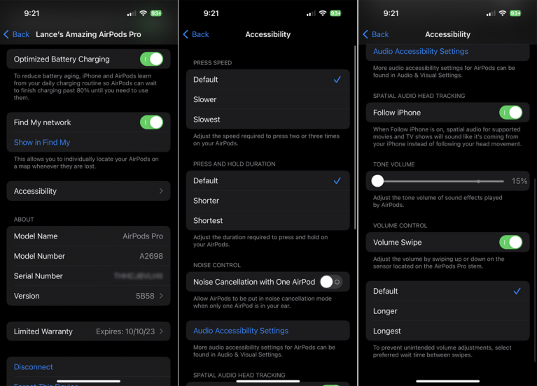 若要进一步控制 AirPods Pro 的某些辅助功能,请前往“设置”>蓝牙> [您的 AirPods 信息图标] >“辅助功能”。在这里,您可以更改按下 AirPods 阀杆以暂停、播放、向前跳过或返回所需的速度。您还可以调整按下阀杆以更改降噪模式所需的时间。此外,您可以使用一个 AirPod 启用降噪并控制音量滑动。