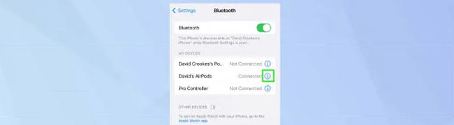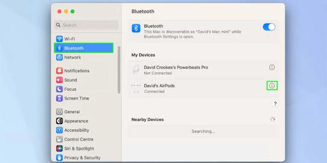 现在,单击左侧菜单中的蓝牙,然后选择您要检查的 AirPods 旁边的“i”图标。