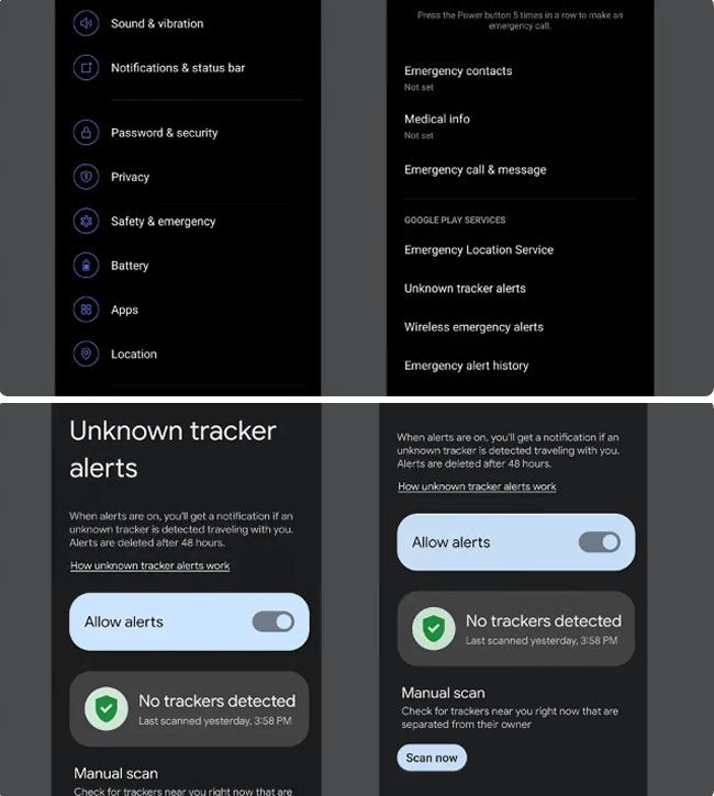 至于此大型“查找我的设备”更新中的未知跟踪器组件,该组件现已可用,并且默认情况下应启用。但要检查或禁用它,只需在手机上转到“设置”>“安全和紧急情况”(如果您的手机运行的是 Android 11 或更早版本,则转到“设置”>“个人安全”),然后向下滚动并点击“未知跟踪器警报”。