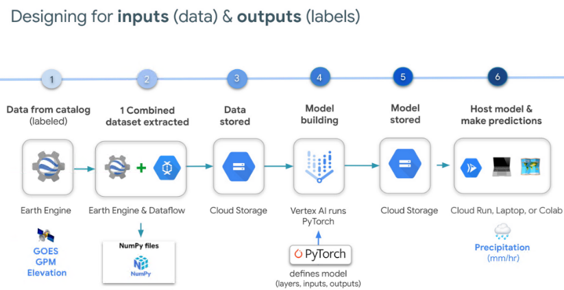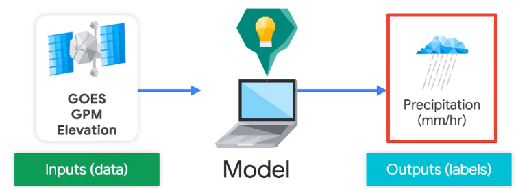 用于训练和部署我们的临近预报模型的架构从我们的输入开始(我们将使用的数据集中在Earth Engine中的降水量 ( GPM )、卫星图像 ( GOES-16 ) 和高程)。它以我们的输出结束,这是我们希望模型预测的标签(降水量毫米,每小时降雨或降雪的范围)。