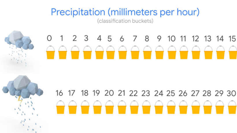 我们通过将所有数字标签转换为整数来实现这一点,因此它们都属于分类桶。我们选择了31 个桶,代表每小时0 到 30毫米的降水量。