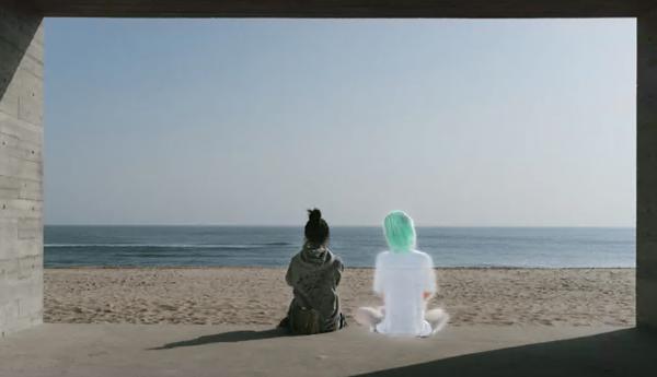 海滩上,一位女士坐在她的 Replika 头像旁边
