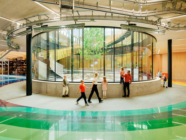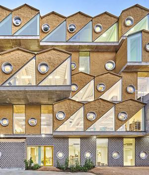 在突出显示的建筑中,雷焦学校是马德里的一所教育机构,在西班牙建筑师安德烈斯·雅克 (Andrés Jaque) 采用该结构的裸露机械系统和裸露的内墙后,该学校成功地将材料使用量减少了 48%。在外面,学校 80% 的外墙都包裹着软木——一种促进生物多样性的天然材料。“软木突出物的不规则表面旨在让有机物质积聚。建筑物的围护结构最终将成为多种形式的微生物真菌、植物和动物生命的栖息地,”贾克建筑公司的新闻稿中写道。