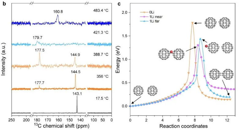 a) 用斯坦哈特型阶次参数(OP)表示的fcc C60势能面。根据得到的碳的几何特征,圈出五个不同的区域来引导眼睛,并列出了其中四个的代表结构:(A)fcc C60,(B)由1D富勒烯聚合物链组成的聚合物晶体,(C)由2D富勒烯聚合物网络组成的聚合物晶体,(D)由2D富勒烯聚合物网络组成的聚合物晶体,以环为连接, (E)管间聚合的一维花生形管,(F)开笼花生形管,(G)1D连接状石墨烯状结构,(H)二维弯曲状石墨烯状结构,(I)3H石墨和(J)残余卡宾。b) 根据温度获得的 2C 化学位移光谱,从原位 MAS-SSNMR 数据获得,同时用 2 mg α-Li13N 加热 500 mg C60。c) 计算出两个没有Li吸附的隔离C100笼的3 + 2聚合的反应能路径(“2 Li”),其中一个Li原子吸附在sp60键合位点附近(“0 Li附近”)或一个Li原子远离sp3键合吸附(“1 Li far”)。