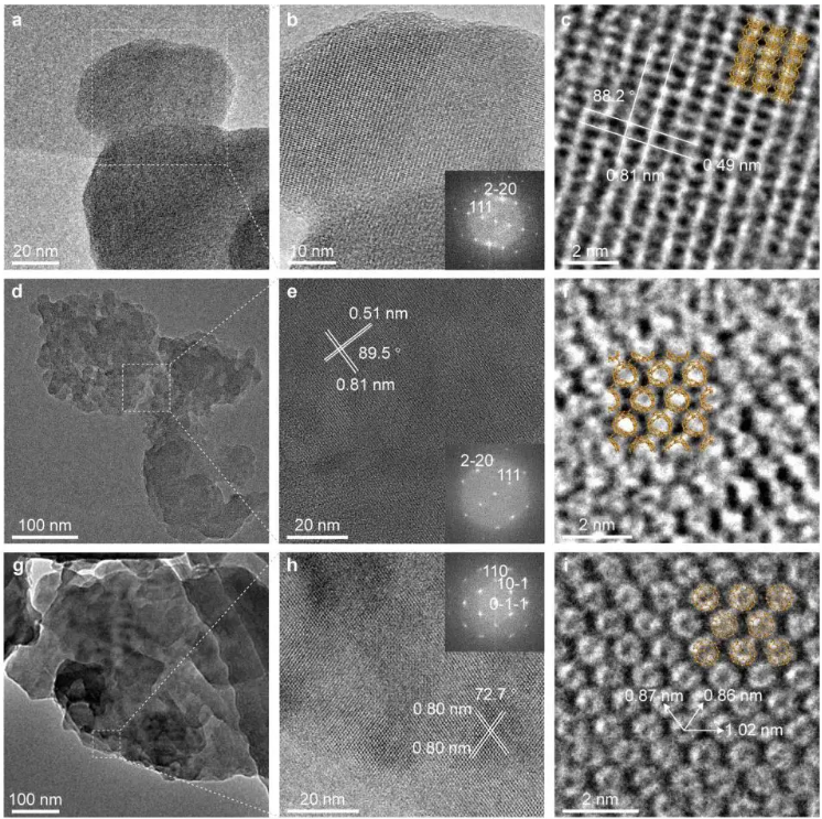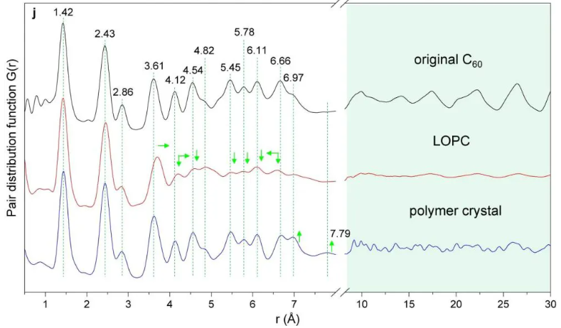 a) 原始 C60 粒子的 TEM 图像。b) 插图中带有 FFT 的放大视图。c) 显示 FCC C111 的 (0) (81.220 nm) 和 (0) 平面 (49.60 nm) 间距的高分辨率图像。d) LOPC 粒子的典型 TEM 图像。e) 放大视图和 FFT。f) 高分辨率图像显示 LOPC 晶体中的变形和连接笼。g) 聚合物晶体颗粒的典型 TEM 图像。h) 放大视图和 FFT。i) 高分辨率图像显示聚合物晶体中标记的单个 C60 笼的中心到中心距离;建议的结构由每个碳的C,F和I中的橙色覆盖层显示。j) 原始C60,LOPC和聚合物晶体的中子PDF。标记0.7nm以下主峰的距离,这是C60保持架的直径。绿色箭头表示与原始C60相比,LOPC和聚合物晶体中峰位置和强度的变化。学分:基础科学研究所