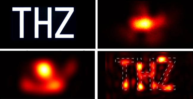 科学家们利用一种新的超级透镜技术,通过虚拟后观察技术来观察宽度仅为 0.15 毫米的物体。初始光学测量显示对象“THZ”[代表所用光的太赫兹频率][右上];正常镜头后[左下];以及超级透镜之后的效果[右下]