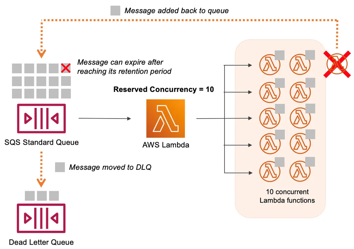 当 SQS 队列中有大量消息时,Lambda 会横向扩展,添加额外的函数来处理消息。扩容会消耗账户中的并发配额。为防止这种情况发生,您可以为各个 Lambda 函数设置预留并发。这确保了指定的 Lambda 函数始终可以扩展到那么多的并发性,但也不能超过这个数字。