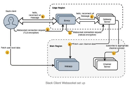 每个 Slack 客户端都有一个到 Slack 服务器的持久 WebSocket 连接,以接收实时事件以维护其状态。客户端通过几个步骤建立 WebSocket 连接,例如从 Webapp 后端获取用户令牌和 WebSocket 连接设置信息。然后客户端向最近的边缘区域发起 WebSocket 连接,GS 获取用户信息并向客户端发送第一条消息。Envoy负载平衡传入流量并处理 TLS 终止。