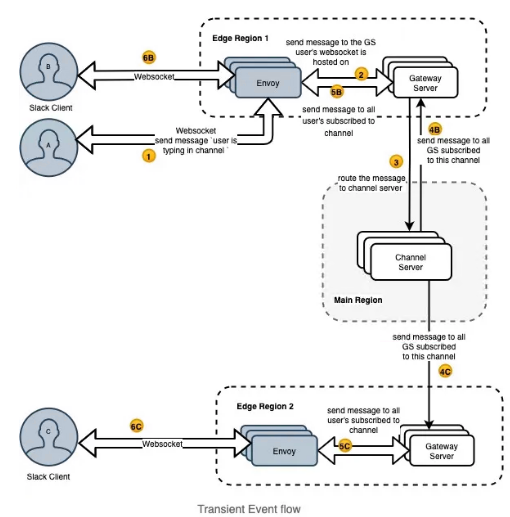 除了聊天消息之外,事件是另一种实时更改客户端状态的消息类型。瞬态事件(例如用户在频道中键入内容)遵循略有不同的流程,因为数据库不会保留这些事件。下图说明了此流程。