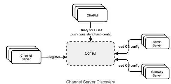 该系统的后端由几个服务组成。频道服务器 (CS) 是有状态的内存服务器,用于保存频道历史记录。一致的哈希机制将每个 CS 映射到通道子集。在高峰时期,每个主机服务约 1600 万个频道。Consistent hash ring manager (CHARMs) 为 CS 管理一致性哈希环,确保在 20 秒内更换不健康的 CS。Consul 存储一致性哈希的最新配置。