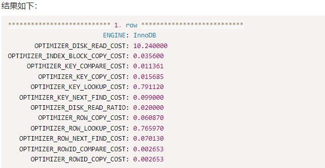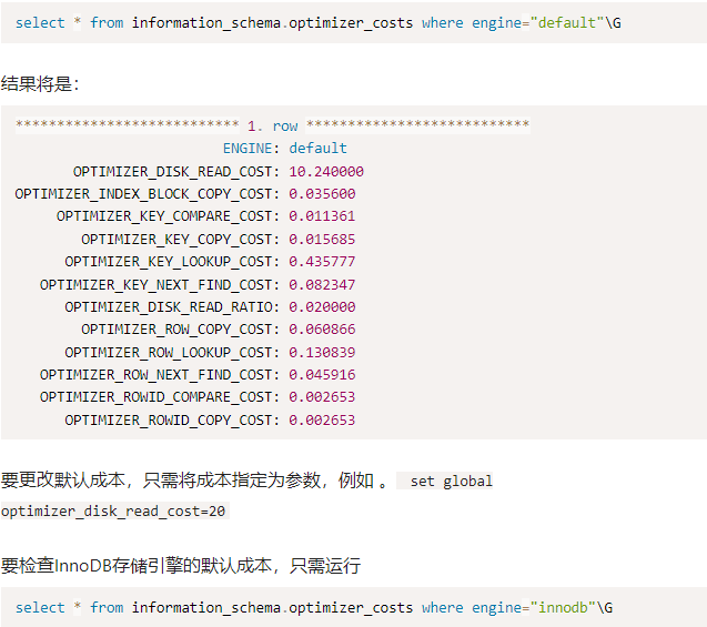 所有特定于发动机的成本都可以在 中找到。若要查看引擎的默认成本,可以使用以下查询:information_schema.optimizer_costs