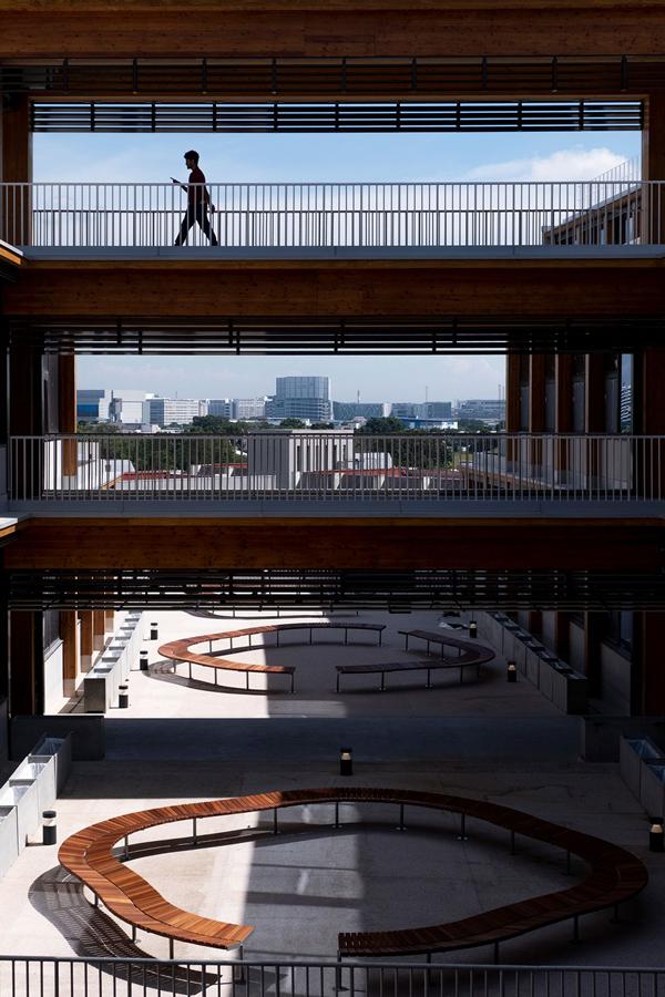 通风的露台和阳光普照的中庭贯穿整个设计。在大楼启用时,大学校长何德华在致辞中吹嘘拥有“新加坡最绿色的校园”。商学院的学生对他们的新家的看法还有待观察——直到 8 月新学年开始,这里才会开始上课。但越来越多的证据表明,在建筑中使用木材可以对居住者的福祉产生积极影响,包括减轻压力水平。
