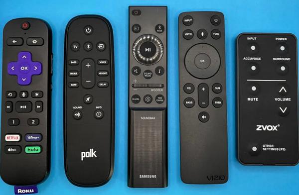 这些是 Roku、Polk、Samsung、Vizio 和 Zvox soundbar 附带的遥控器。(Sonos Arc 没有。)它们都不错,但我最喜欢 Roku 的