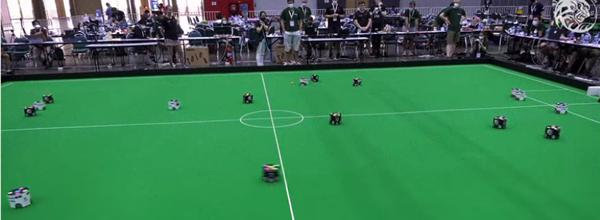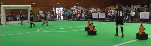 中型 联赛使用全尺寸足球和齐腰高的轮式机器人的机载感知。多年来,它展示了在人类速度、人类规模足球方面取得的巨大进步。在最近的比赛中,机器人在大场地上敏捷移动,自主制定进攻和防守策略,协调传球和射门。典型的中型机器人具有小学人类的技能,尽管在这个联盟中机器人不必担心腿部。在某些方面,中型机器人比人类球员更具优势——机器人具有全向感应、无线通信,并且凭借机械发射系统能够始终如一地进行非常准确的击球。