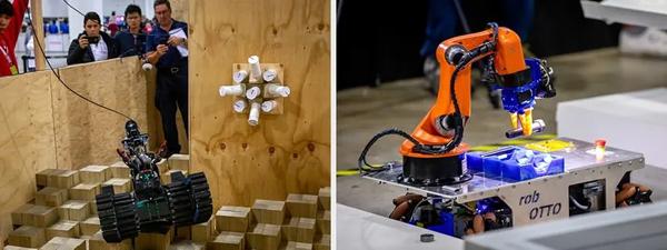 作为 RoboCup Rescue 的一部分,救灾机器人正在穿越具有挑战性的移动路线[左],而工业移动机械手则在 2019 年悉尼 RoboCup 的 RoboCup@Work 活动中完成任务[右]。机器人世界杯联合会 (2)