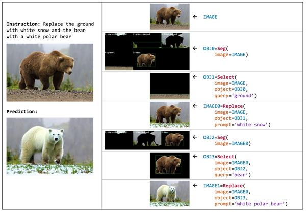 AI2 研究人员开发的VISPROG是一种元模型,它使用多功能代码工具箱执行复杂的视觉操作任务。假设你有一张灰熊在草地上的照片(如图所示)——你可以告诉它“用雪地上的北极熊替换熊”,它就会开始工作。它识别图像的各个部分,在视觉上将它们分开,搜索并找到或生成合适的替换,然后智能地将整个图像重新缝合回来,而无需用户进一步提示。《银翼杀手》的“增强”界面开始显得平淡无奇。这只是其众多功能之一。