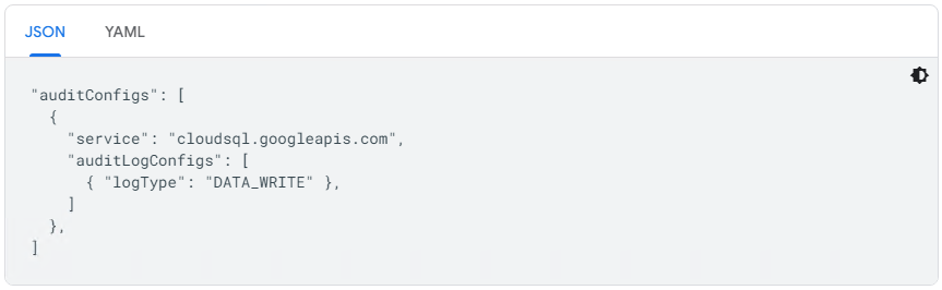 以下配置会为 Cloud SQL 启用 DATA_WRITE 数据访问审核日志: