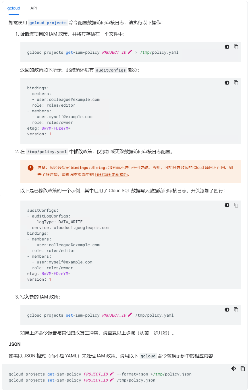 以下示例演示了如何使用 gcloud 命令和 Resource Manager API 配置项目的数据访问审核日志。