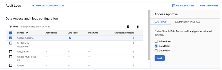在以下示例中,您可以看到 Access Approval 服务启用了数据读取审核日志类型: