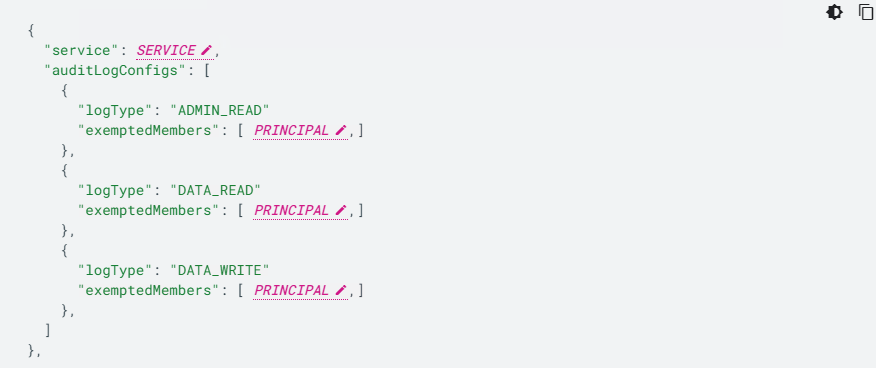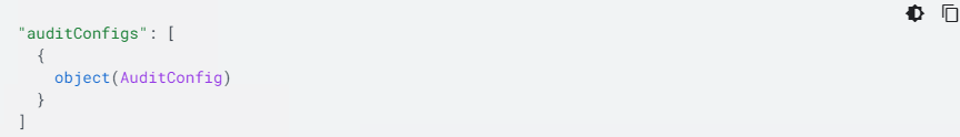 下面的部分更详细地介绍了 AuditConfig 对象。如需了解用于更改配置的 API 和 gcloud CLI 命令,请参阅 getIamPolicy 和 GTVS